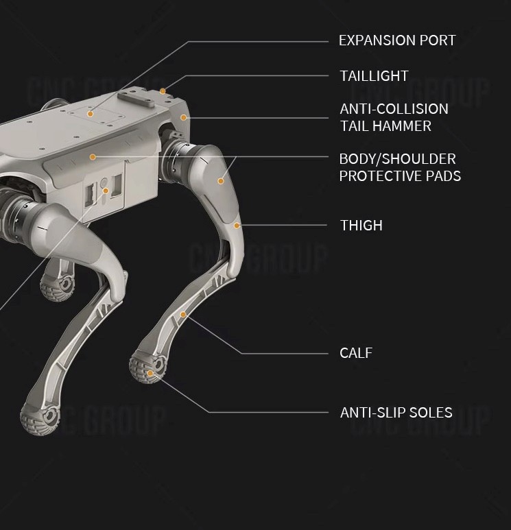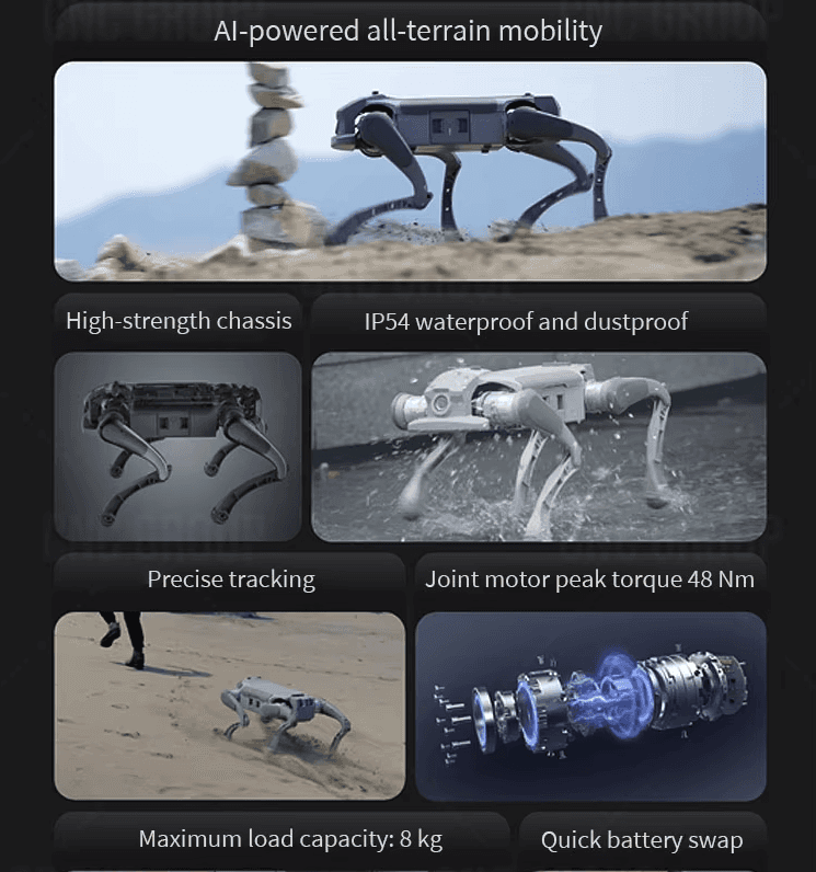 The robot dog features advanced mobility, handling obstacles, slippery terrain, and carrying up to 120kg. Equipped with cameras, lidar, and ultrasonic sensors, it perceives surroundings, identifies objects, and maps 3D environments for navigation and obstacle avoidance. It can be app- or voice-controlled, enabling interactive responses. Applications include industrial inspections, detecting damaged goods, and in firefighting, transmitting real-time images and sensing toxic gases.